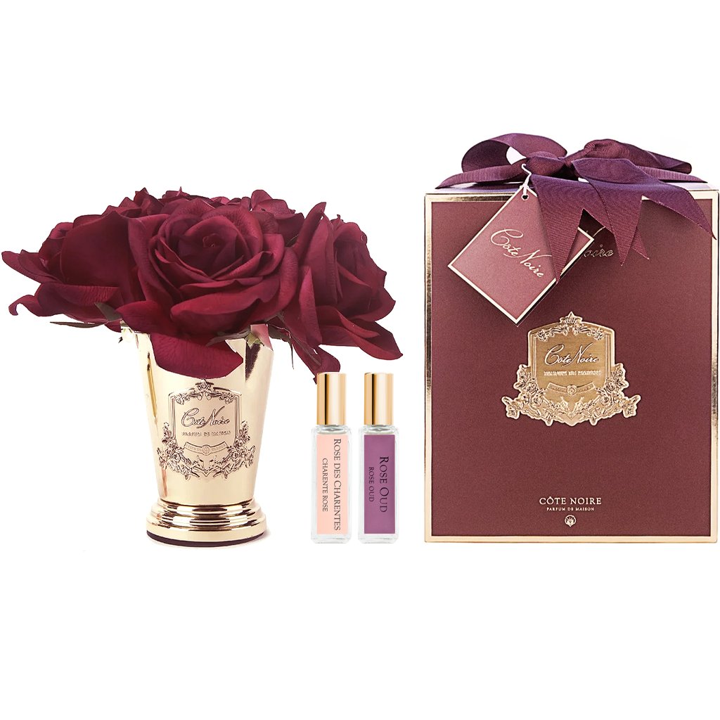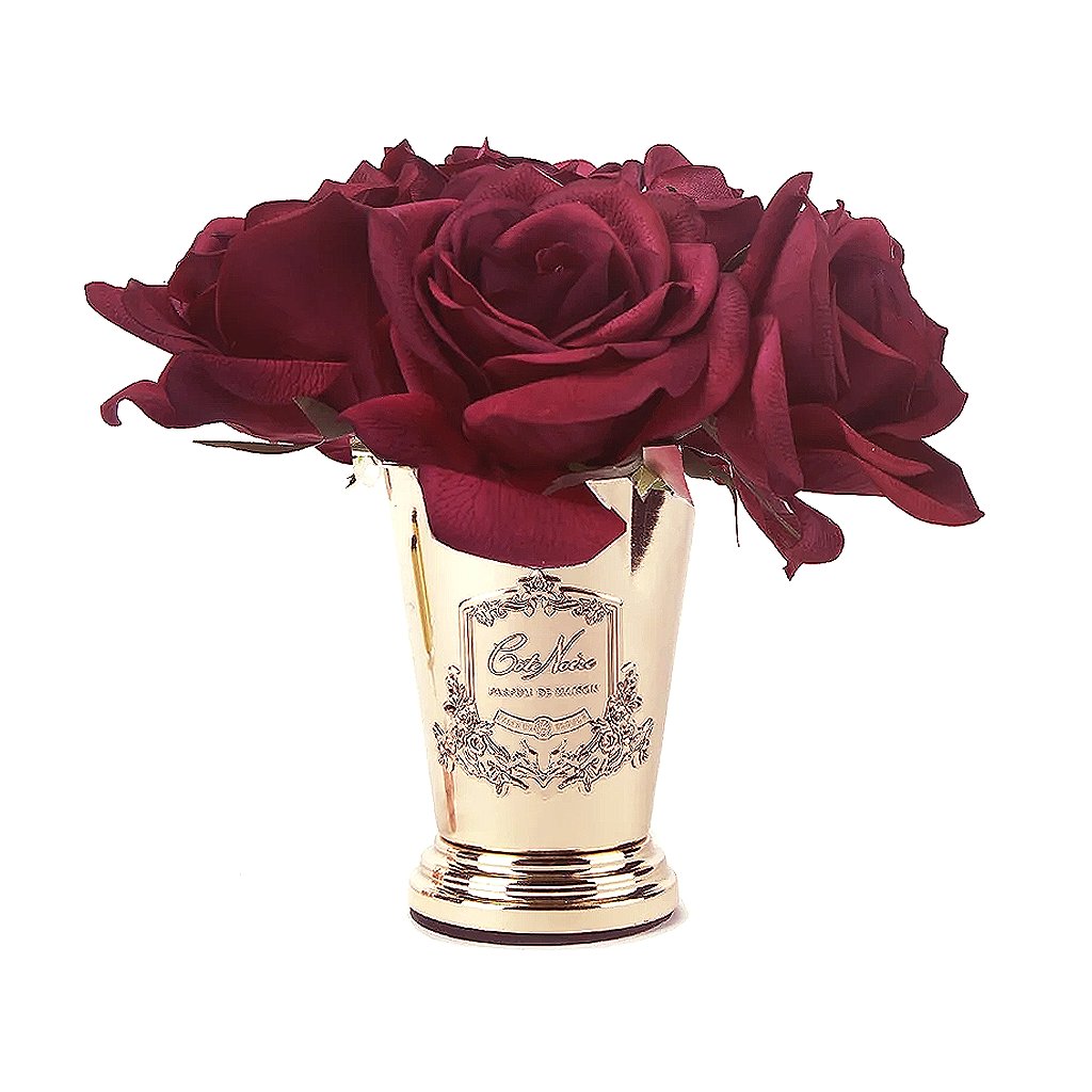Luxusní parfémovaná kytice 7 karmínově červených růží ve stylovém zlatém poháru prezentovaná v atraktivním boxu s velkou romantickou mašlí. Každá růže je precizně zpracována a opatřena speciálním povlakem, který dodává okvětním lístkům přirozený vzhled. Součástí balení jsou francouzské parfémy Charente Rose a Rose Oud, které se aplikují přímo na růže dle preferované intenzity vůně.