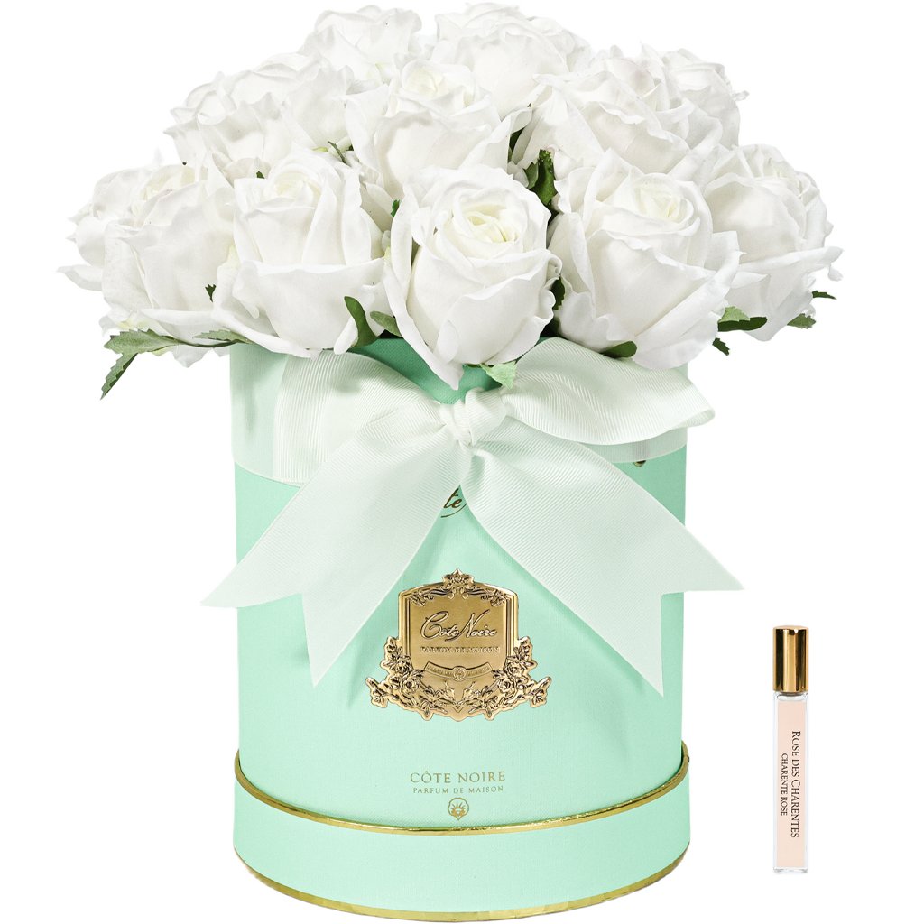 K umocnění tohoto smyslového zážitku je součástí balení 10ml flakon s pravým francouzským parfémem Charente Rose. Tato esence zachycuje podstatu růže v křehkých svěžích horních tónech růžových okvětních lístků, které se snoubí s bylinnými akordy, aby celý dojem posléze spočinul na teplém a elegantním základu bílého pižma. Kapka tohoto parfému dokáže kdykoli probudit a oživit smyslnou, trvalou vůni aranžmá, čímž zajišťuje, že kouzlo vaší kytice nikdy nepomine.