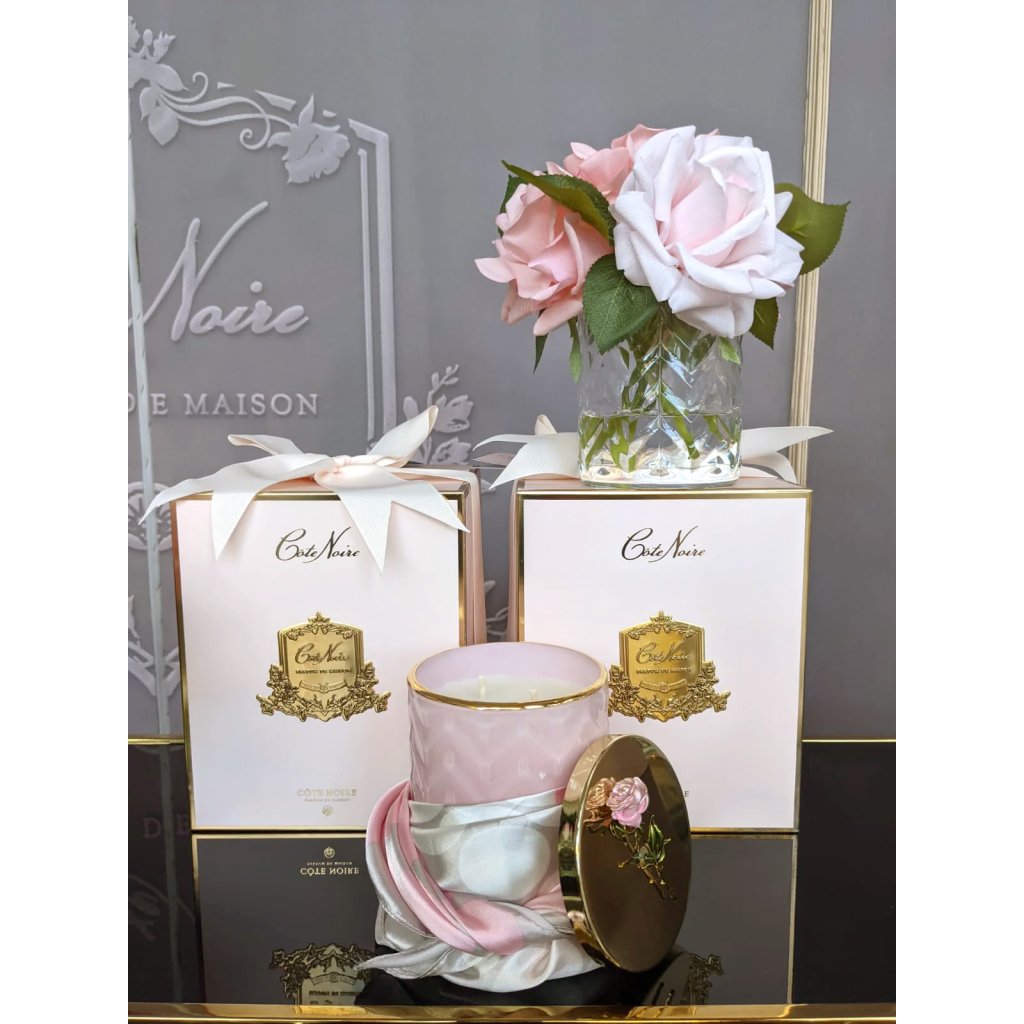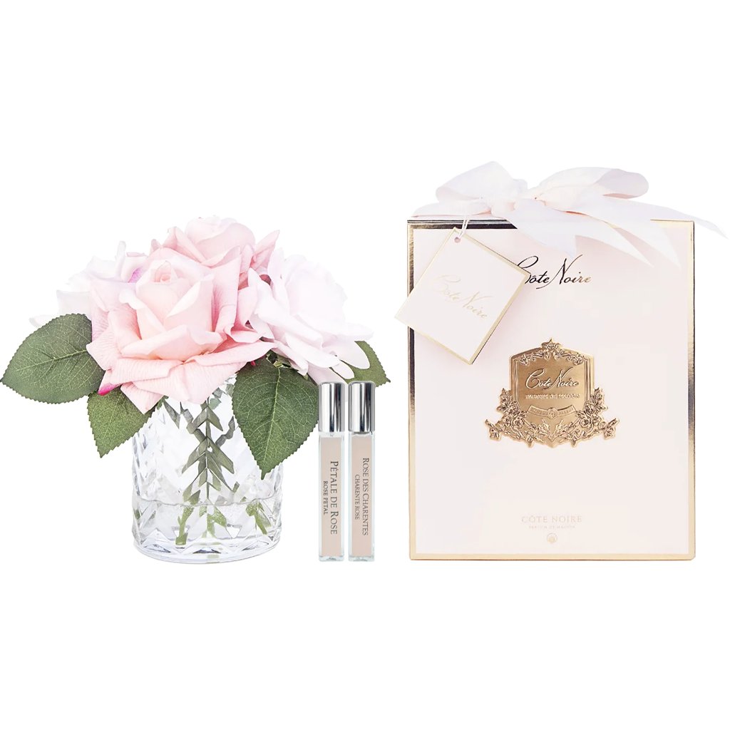 Luxusní parfémovaná kytice 5 velkých růží Mixed Pink v elegantní váze s reliéfním vzorem Herringbone prezentovaná v růžovém boxu s kovovou plaketou a romantickou mašlí. Každá růže je precizně zpracována a opatřena speciálním povlakem, který dodává okvětním lístkům přirozený vzhled. Součástí balení jsou dva prvotřídní francouzské parfémy Rose Petal a Charente Rose, které se aplikují přímo na růže dle preferované intenzity vůně.