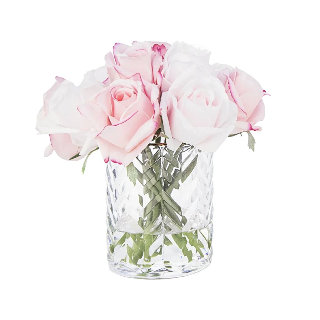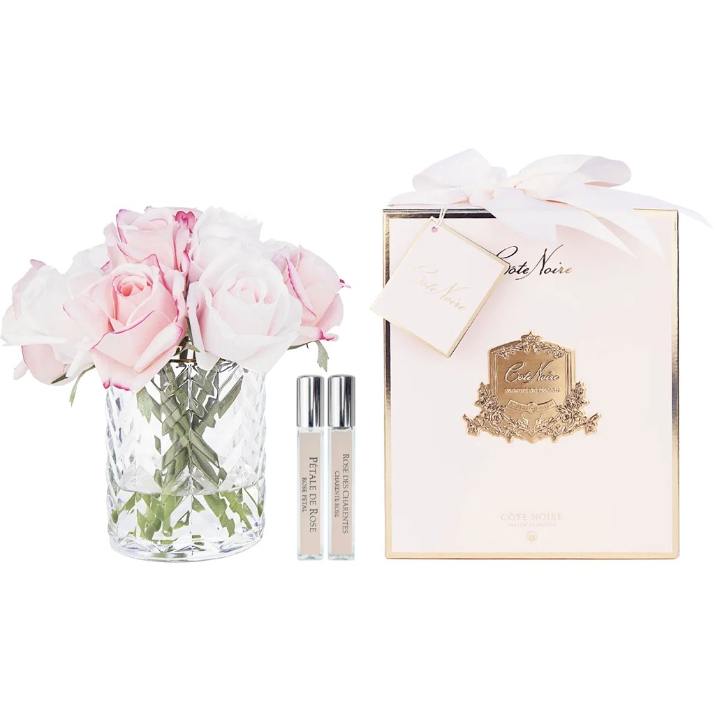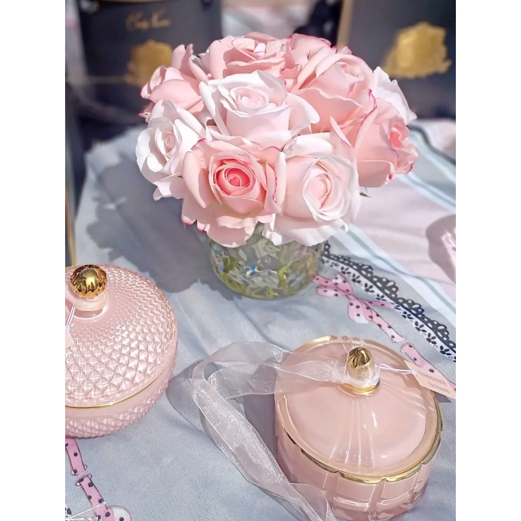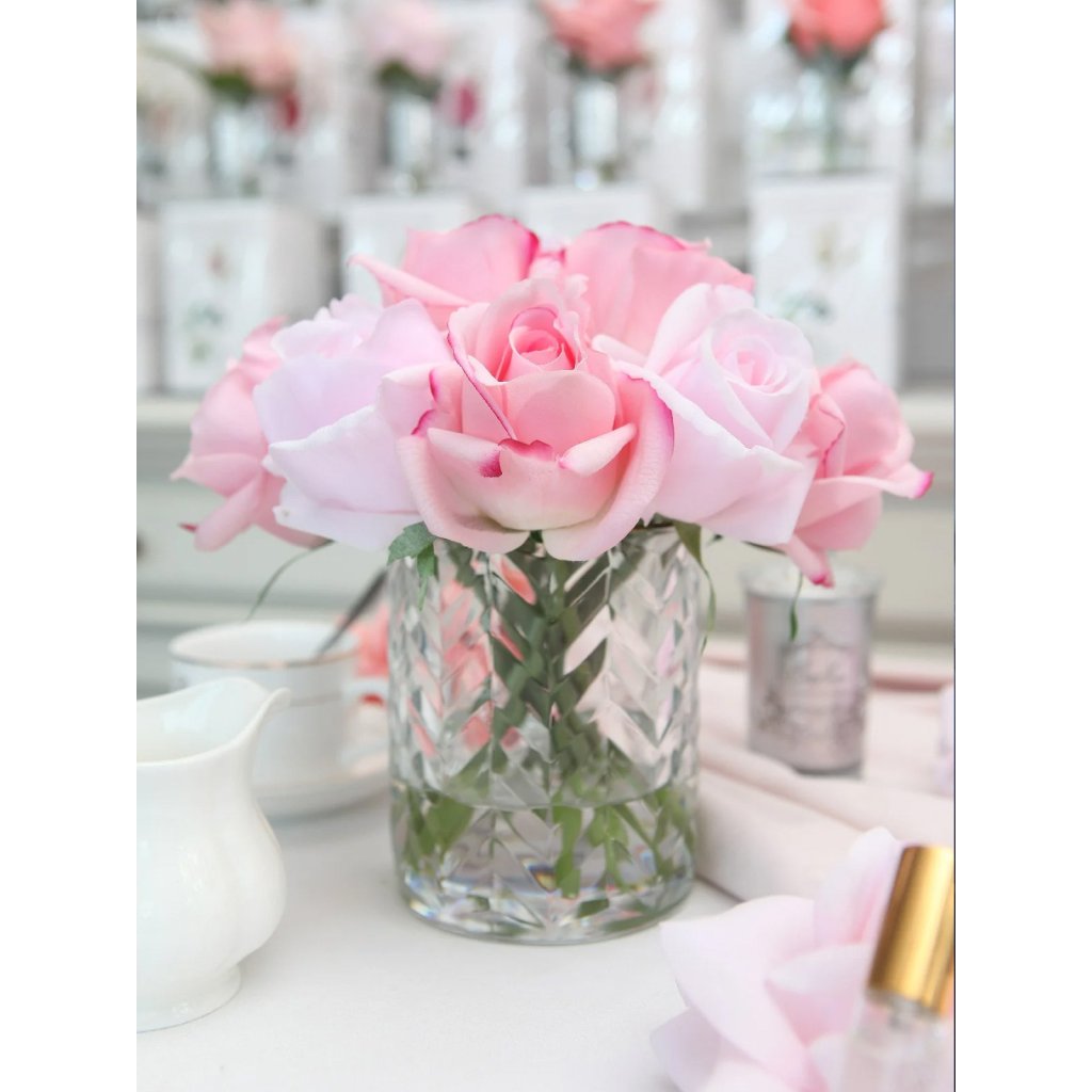 Luxusní parfémovaná kytice 11 růžových poupat v elegantní skleněné váze s reliéfním vzorem Herringbone prezentovaná v růžovém boxu se zlatou kovovou plaketou a velkou romantickou mašlí. Každá růžička je precizně zpracována a opatřena speciálním povlakem, který dodává okvětním lístkům přirozený vzhled. Součástí balení jsou dva prvotřídní francouzské parfémy Rose Petal a Charente Rose, které se aplikují přímo na růže dle preferované intenzity vůně.