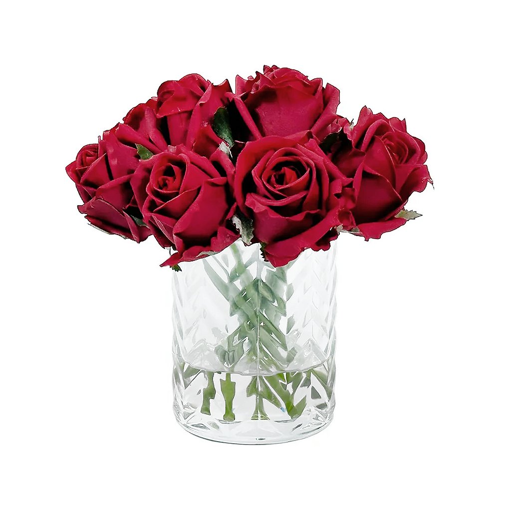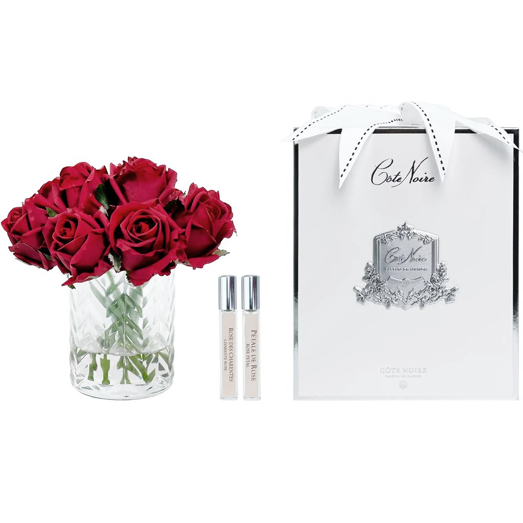 Luxusní parfémovaná kytice 11 karmínově rudých růžových poupat Carmine Red v elegantní skleněné váze s reliéfním vzorem Herringbone prezentovaná v bílém boxu se stříbrnou kovovou plaketou a velkou romantickou mašlí. Každá růžička je precizně zpracována a opatřena speciálním povlakem, který dodává okvětním lístkům přirozený vzhled. Součástí balení jsou dva prvotřídní francouzské parfémy Rose Petal a Charente Rose, které se aplikují přímo na růže dle preferované intenzity vůně.