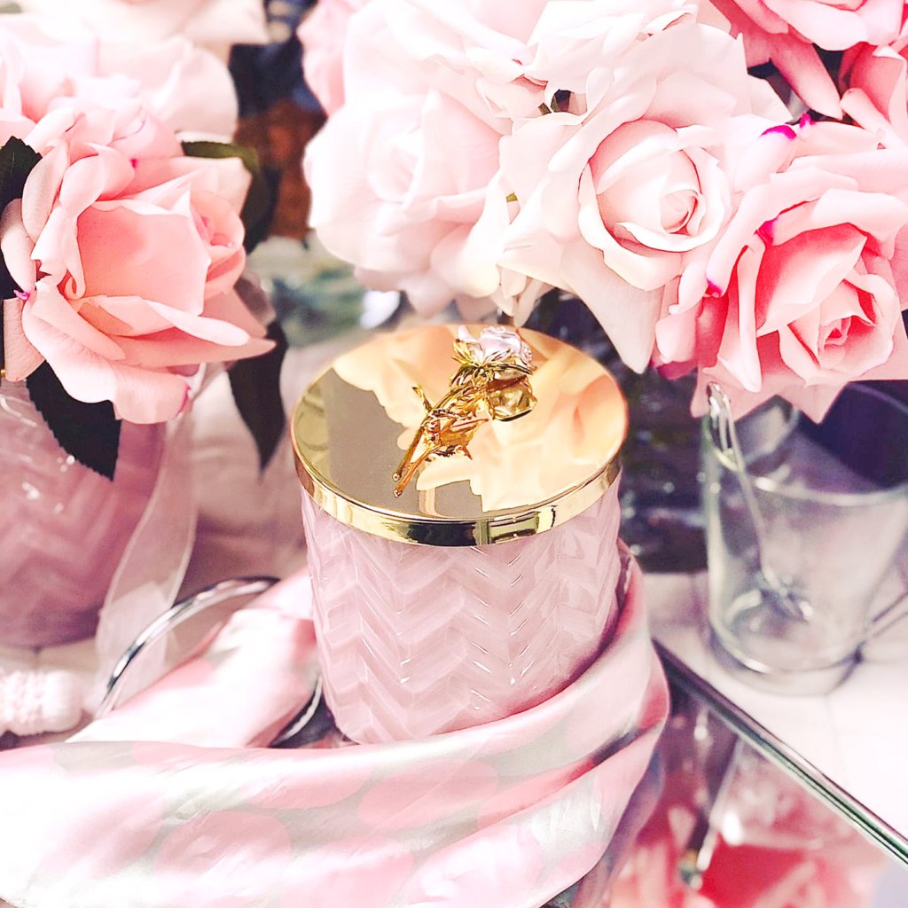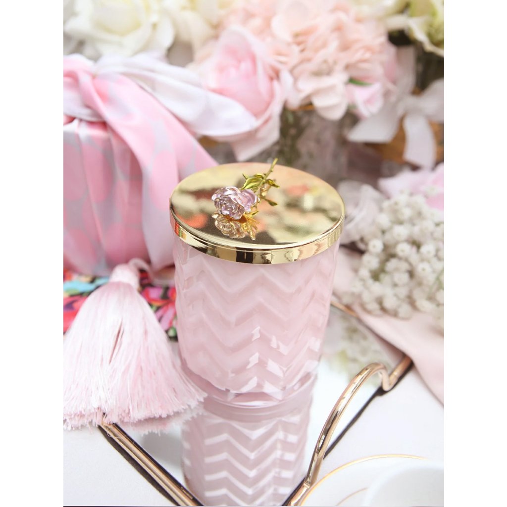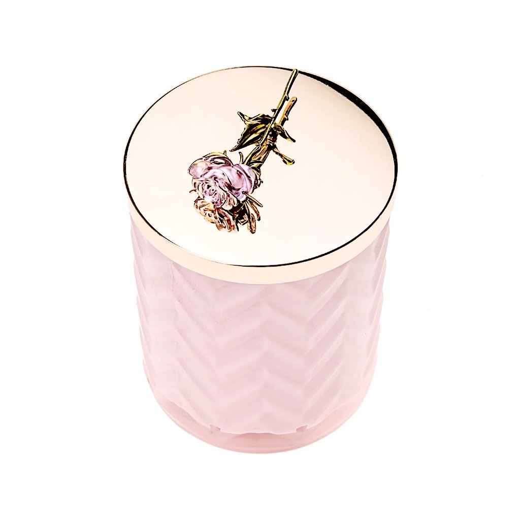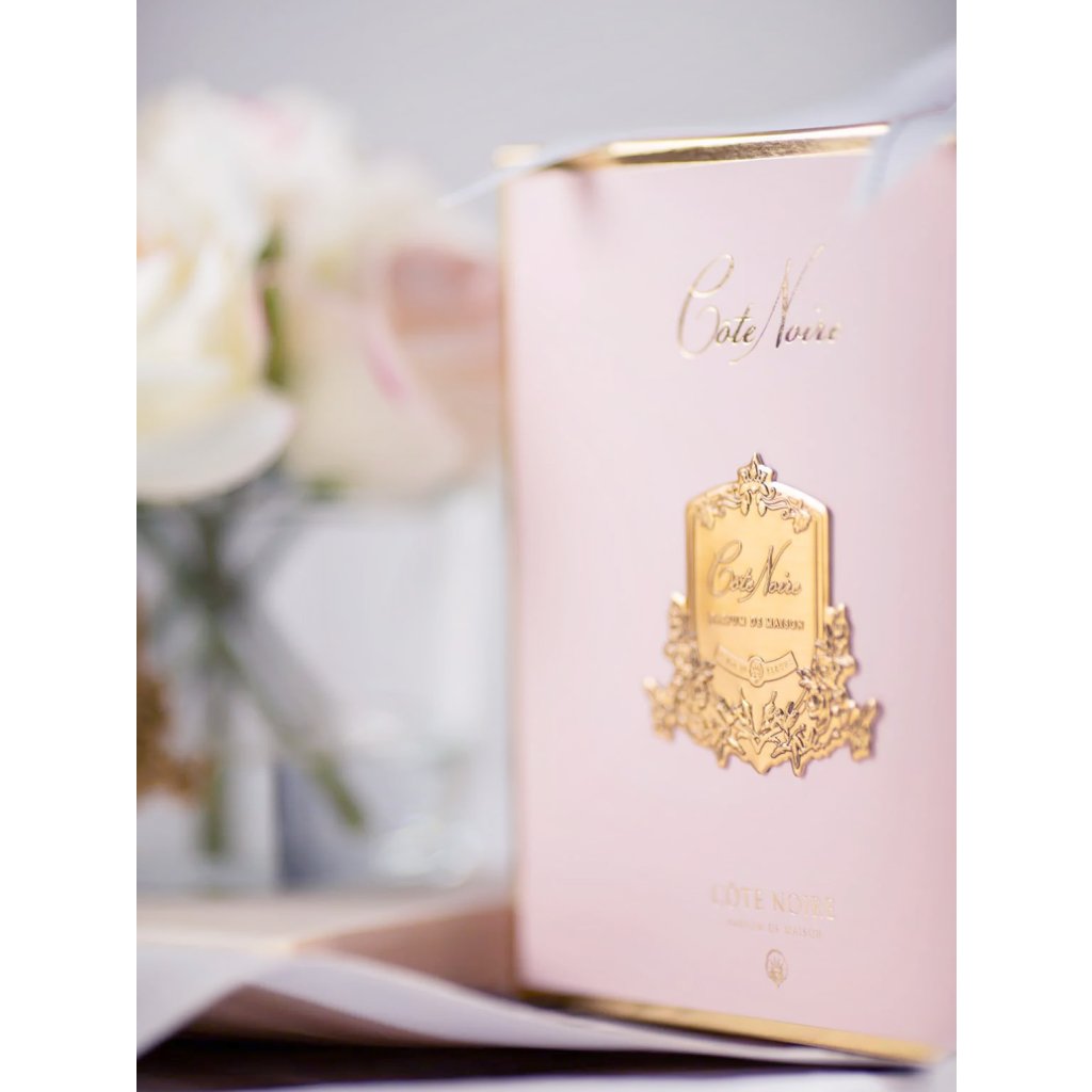Okouzlující svíčka Côte Noire z růžového skla s elegantním vzorem Herringbone a zlatým kovovým víčkem zdobeným nádhernou dekorativní růží působí jako klenot, který přitahuje pozornost všech smyslů. Obsahuje dva bavlněné knoty a krémově bílý přírodní vosk, který zachovává bohaté aroma včetně jemných tónů a zajišťuje čisté hoření po dobu až 100 hodin. Zabalena v růžovém boxu se zlatou kovovou plaketou a velkou romantickou mašlí a doplněna nádherným hedvábným šátkem, svíčka Côte Noire je dokonalý dárek pro milovníky luxusu, který je radost otevřít.