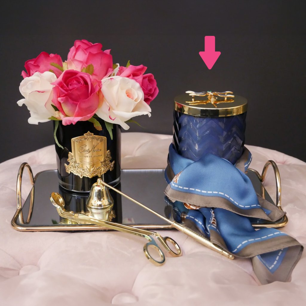 Okouzlující svíčka Côte Noire z modrého skla s elegantním vzorem Herringbone a zlatým kovovým víčkem zdobeným nádhernou dekorativní vážkou působí jako klenot, který přitahuje pozornost všech smyslů. Obsahuje dva bavlněné knoty a krémově bílý přírodní vosk, který zachovává bohaté aroma včetně jemných tónů a zajišťuje čisté hoření po dobu až 100 hodin. Zabalena v modrém boxu se zlatou kovovou plaketou a velkou romantickou mašlí a doplněna nádherným hedvábným šátkem, svíčka Côte Noire je dokonalý dárek pro milovníky luxusu, který je radost otevřít.