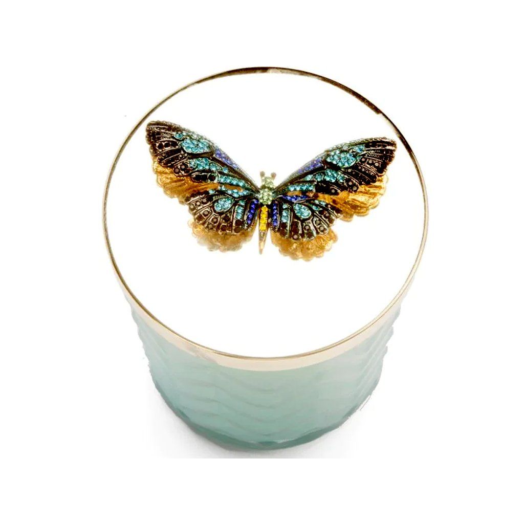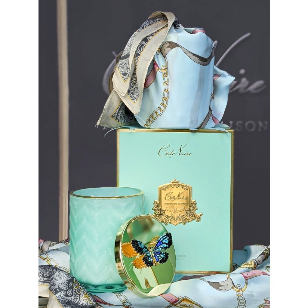 Okouzlující svíčka Côte Noire z tyrkysového skla s elegantním vzorem Herringbone a zlatým kovovým víčkem zdobeným nádherným dekorativním motýlem působí jako klenot, který přitahuje pozornost všech smyslů. Obsahuje dva bavlněné knoty a krémově bílý přírodní vosk, který zachovává bohaté aroma včetně jemných tónů a zajišťuje čisté hoření po dobu až 100 hodin. Zabalena v tyrkysovém boxu se zlatou kovovou plaketou a velkou romantickou mašlí a doplněna nádherným hedvábným šátkem, svíčka Côte Noire je dokonalý dárek pro milovníky luxusu, který je radost otevřít.