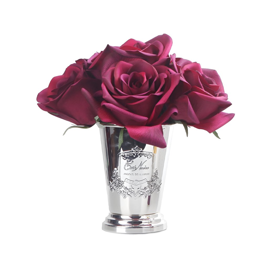 Luxusní parfémovaná kytice 7 růží ve stylovém stříbrném poháru prezentovaná v atraktivním boxu s velkou romantickou mašlí. Každá růže je precizně zpracována a opatřena speciálním povlakem, který dodává okvětním lístkům přirozený vzhled. Součástí balení jsou francouzské parfémy Charente Rose a Rose Oud, které se aplikují přímo na růže dle preferované intenzity vůně.