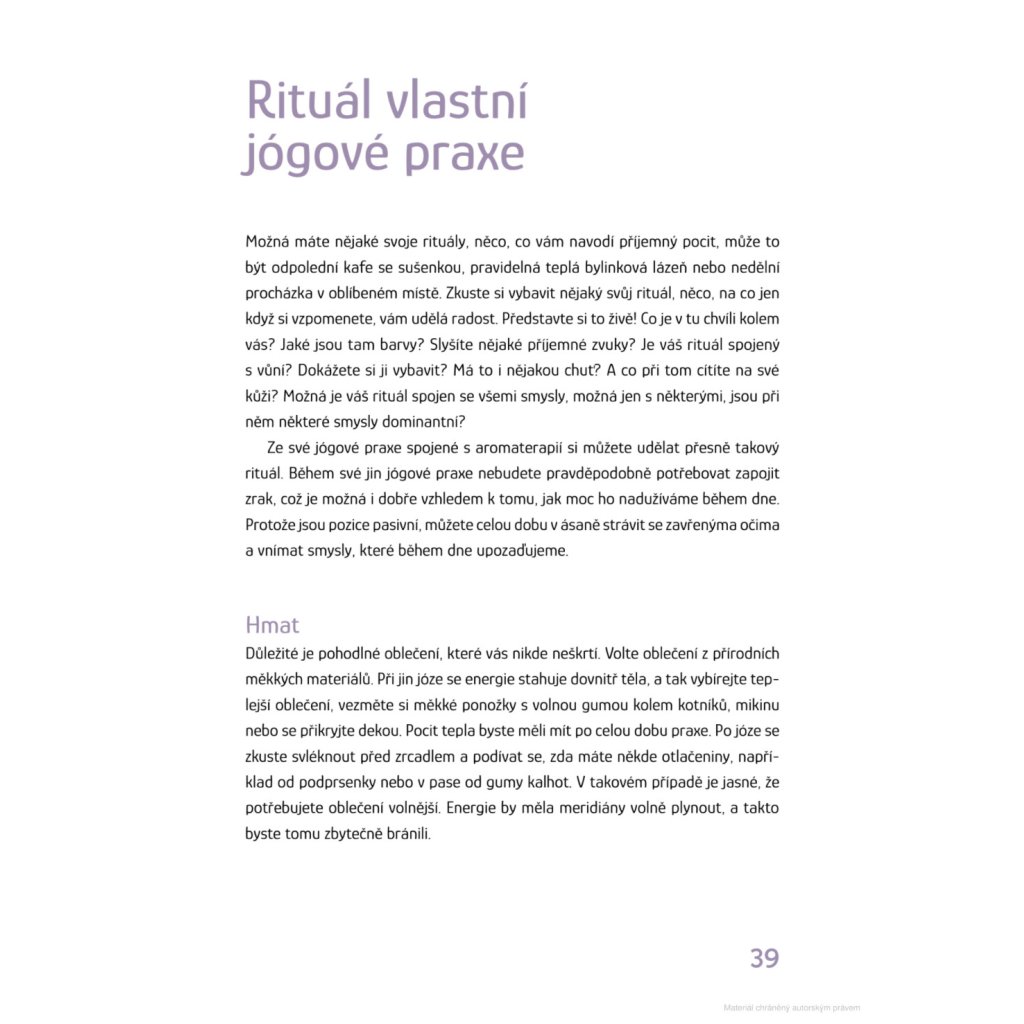 Chcete-li se zbavit neduhů těla, úzkostí mysli a nechat se pohladit po duši, právě jste našli ideálního pomocníka. Tato kniha propojuje jógu a aromaterapii pomocí tradiční čínské medicíny a jejího pojetí pěti elementů. Každý z elementů se v našem těle specificky projevuje. Střídavě podle ročních období, naší kondice, věku nebo pohlaví potřebujeme harmonizovat jeden z elementů. Dozvíte se, jak se v sobě zorientovat a jak vybrat element, s nímž následně budete pracovat pomocí jógy a aromaterapie. Voňavá jóga dokáže z pochmurného dne udělat den plný slunce.