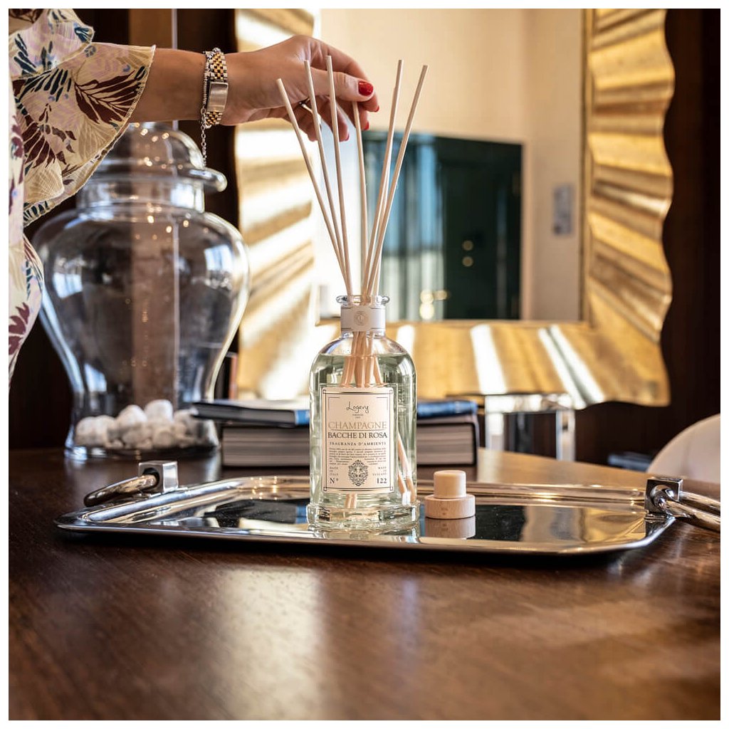 - tyčinkový difuzér s interiérovým parfémem Champagne & Bacche di Rosa zvolené velikosti