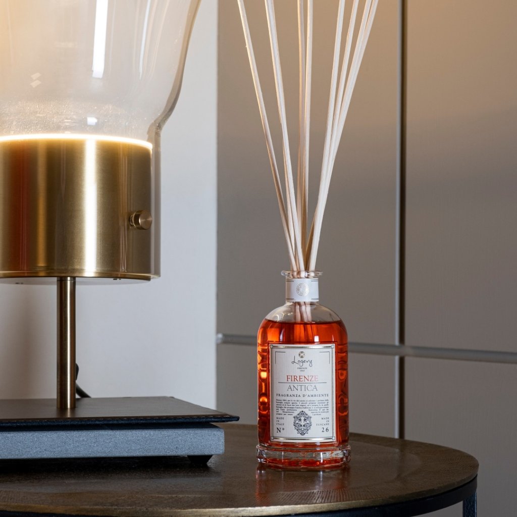 Luxusní difuzér s tyčinkami Logevy Firenze 1965 charakterizuje prvotřídní parfém z pečlivě vybraných surovin nejvyšší kvality a design vyzařující eleganci a noblesu. Do skleněné nádoby stačí vložit přiložené tyčinky a vůně se začne uvolňovat do prostoru.