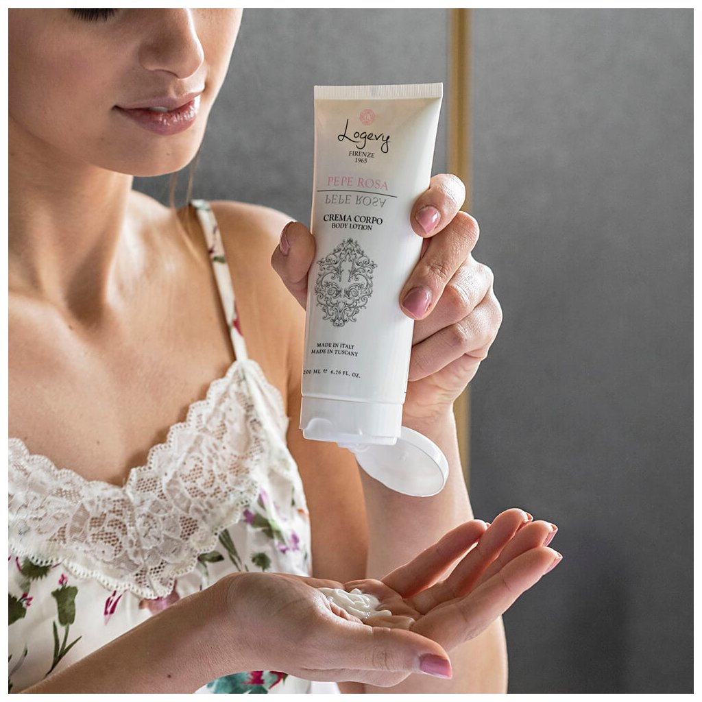 Užijte si dokonalou péči s luxusním tělovým mlékem Pepe Rosa od Logevy Firenze 1965 a dopřejte své pokožce neobyčejný zážitek. Kombinace ingrediencí nejvyšší kvality zajišťuje zářivě krásnou a zdravou pleť s dokonalou výživou, ochranou a hydratací. Lehká konzistence se rychle vstřebává, takže se můžete ihned obléknout bez pocitu mastnoty. Jemné složení je zcela nedráždivé a vhodné pro všechny typy pleti, včetně suché a citlivé.