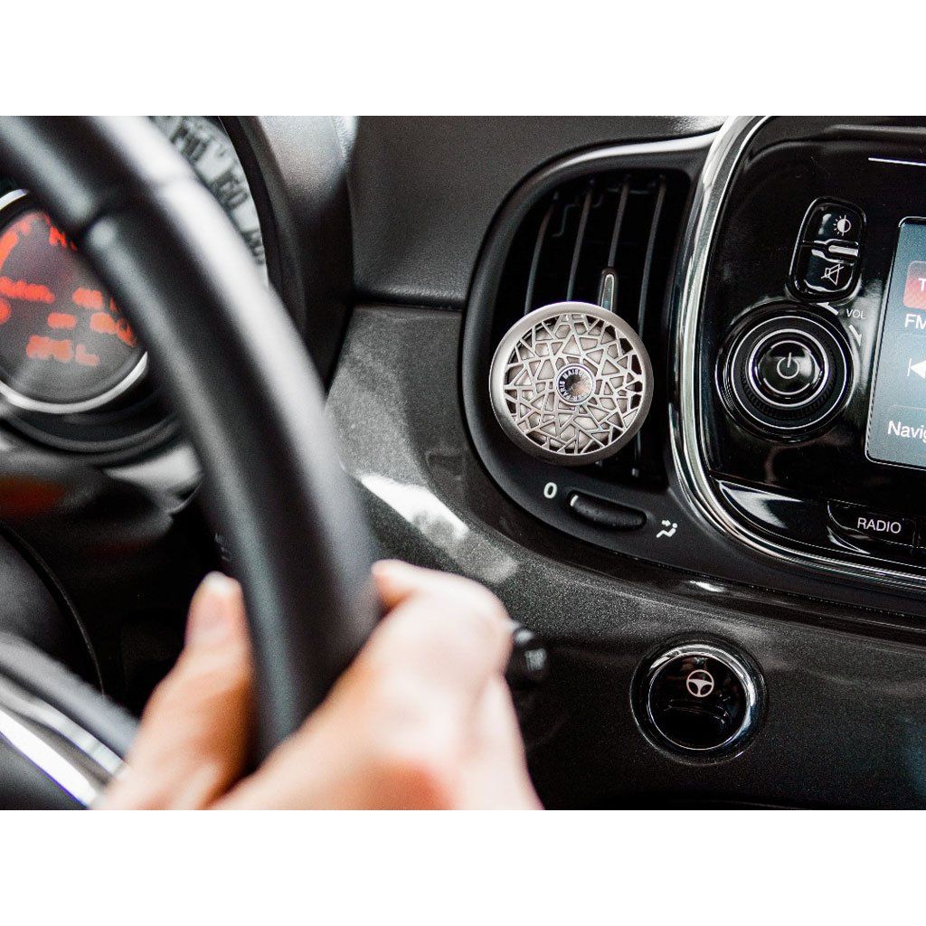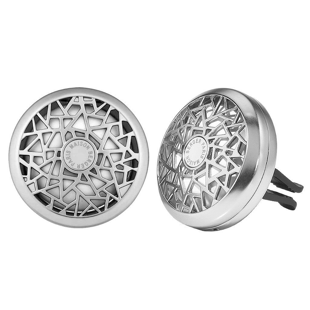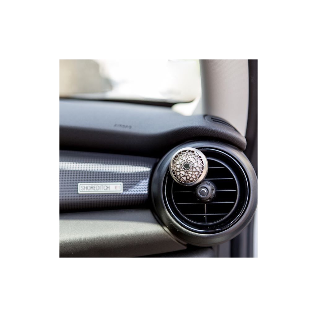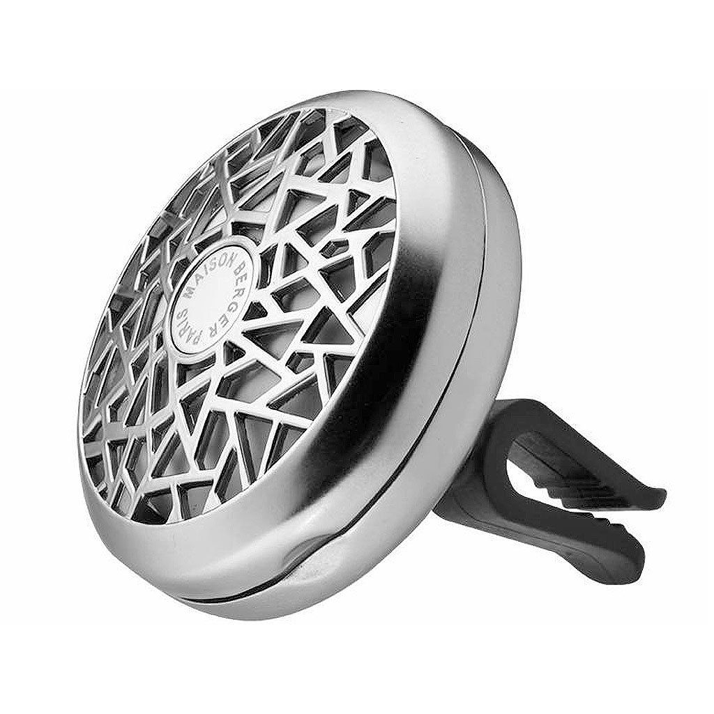 Vůně do auta Maison Berger Paris v provedení kovového medailonu s vyměnitelnou náplní z parfémované keramiky. Stačí odklopit víčko, vložit náplň a upevnit pomocí klipu na výdech ventilace. K uvolňování vůně dochází prouděním vzduchu a po vypotřebování lze jednoduše vyměnit náplň se stejnou nebo jinou vůni.
