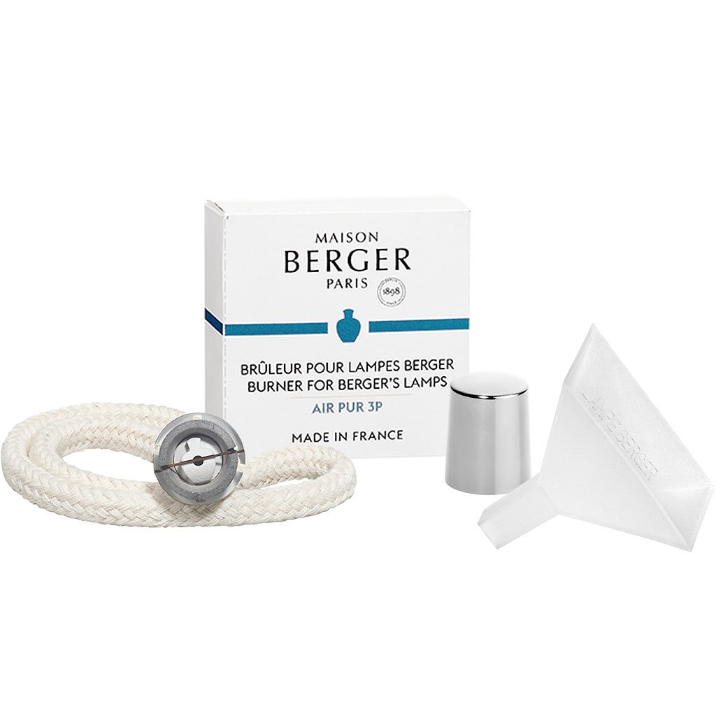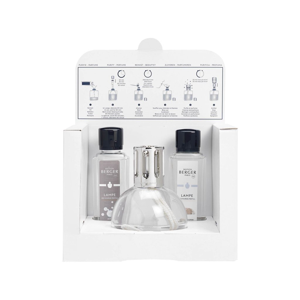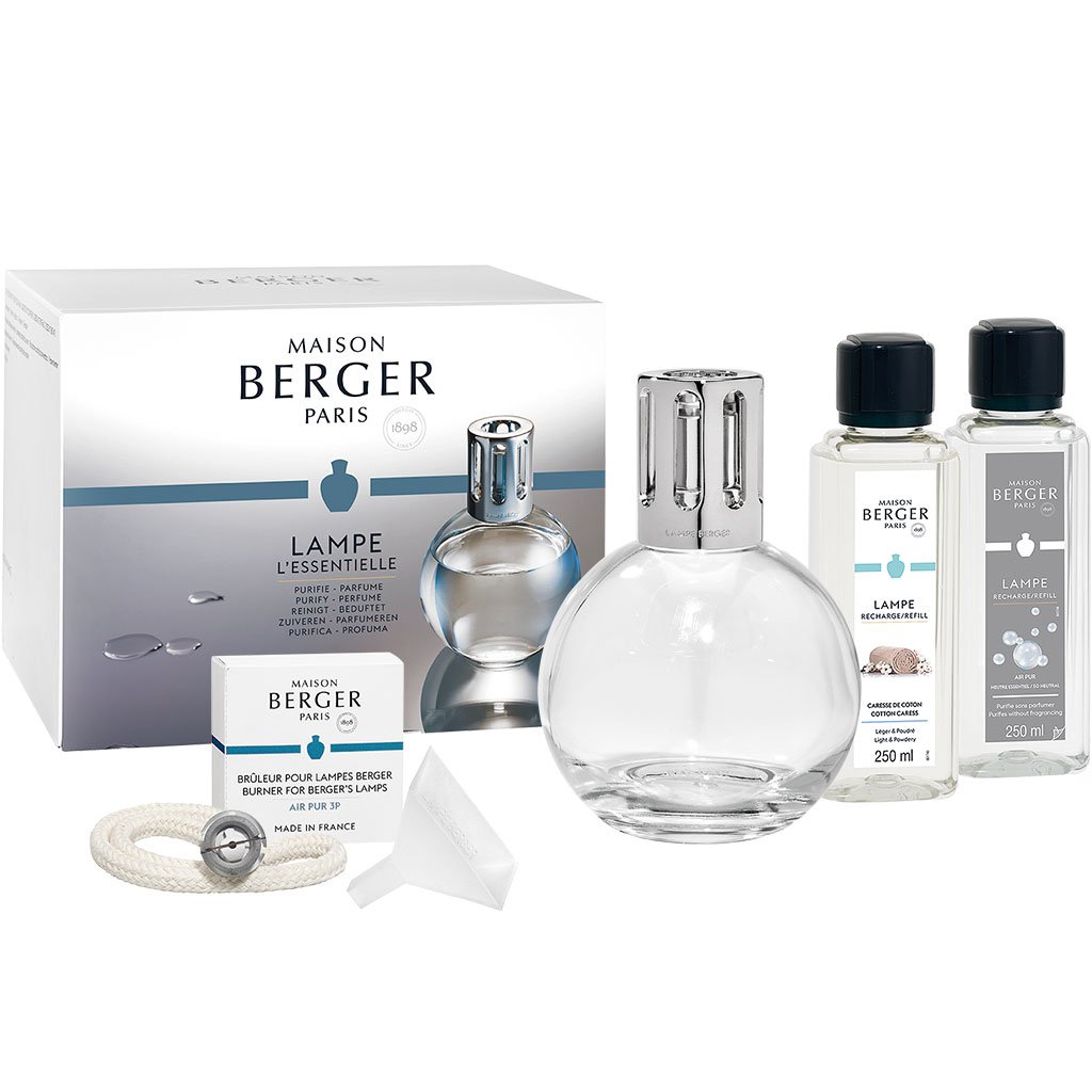 Sada Essential pro snadný úvod do světa interiérových parfémů a katalytických lamp od francouzské značky Maison Berger Paris obsahuje celosvětově nejprodávanější katalytickou lampu Round z čirého skla s masivní stříbrnou korunkou, náplň s vůní čistoty Cotton Caress (Bavlněná péče), neparfémovanou náplň So Neutral (Neutrální) a kompletní příslušenství včetně zaslepovacího víčka, plnícího trychtýře a kahanu s bavlněným knotem. Vše pečlivě zabaleno a připraveno k okamžitému použití a provonění interiéru.