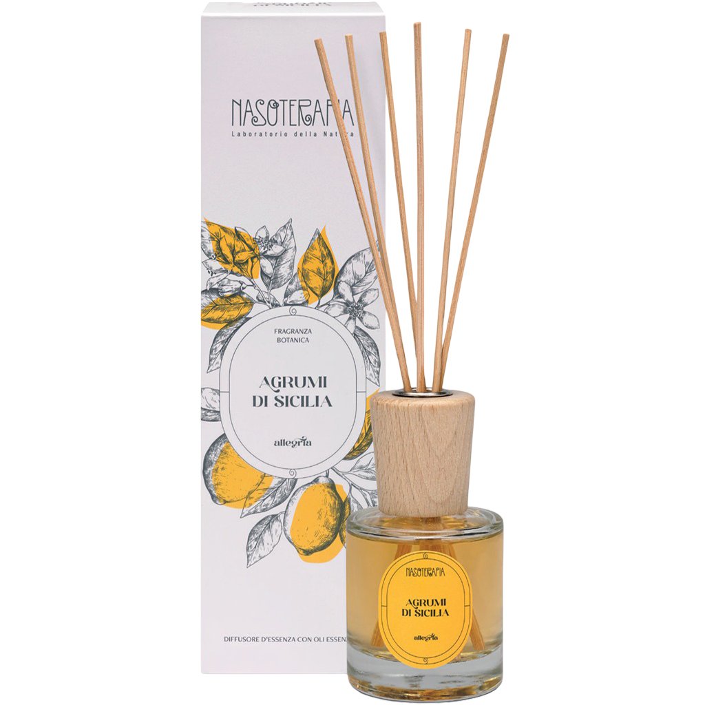 Elegantní tyčinkový difuzér Nasoterapia přináší svěží vůni sicilských citrusů. Čirá skleněná nádoba s bukovou koncovkou a kyticí ratanových tyčinek snadno splyne s jakýmkoliv interiérem a dodá mu přirozený, přírodně laděný charakter. Tyčinky po vložení do nádoby rychle absorbují náplň a téměř okamžitě uvolňují vůni do prostoru.