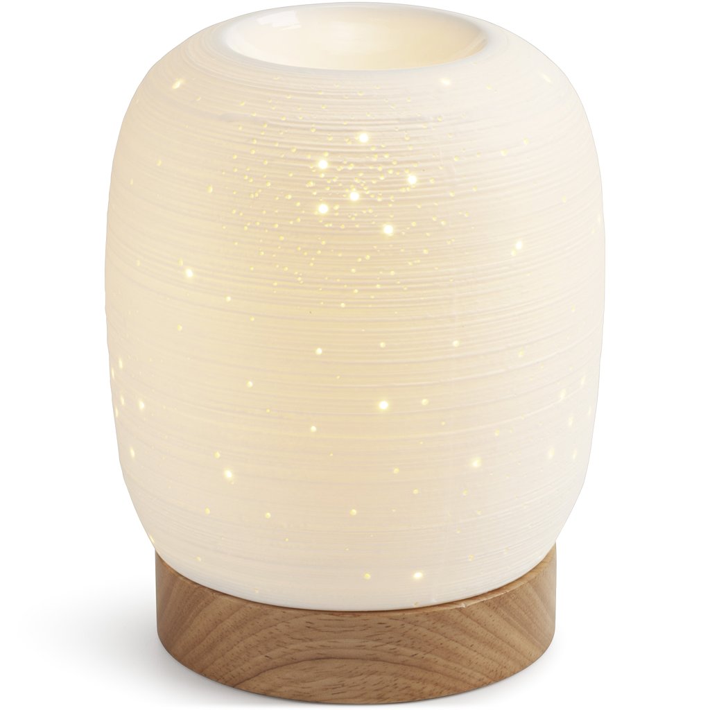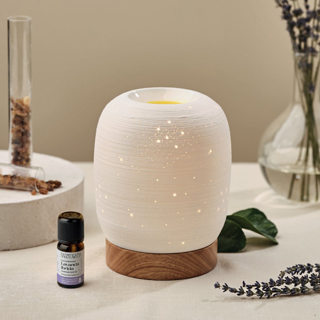 Evaporační difuzér Astra s motivem hvězdné oblohy rozptyluje esenciální oleje do prostoru bez přidání vody a pouze působením tepla žárovky. Je bezpečný i v přítomnosti dětí či domácích mazlíčků a ideální do kanceláře nebo míst, kde nechcete používat oheň či hrozí rozlití. Elegantní provedení z keramiky a dřeva z něj dělá stylový doplněk, který spolu s vůní a tlumeným světlem navodí příjemnou atmosféru.