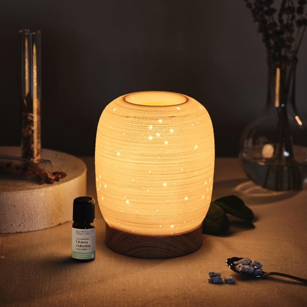 vhodné pro aromaterapii • zcela tichý 0 dB • použití s esenciálními oleji bez vody • provedení keramika a dřevo • podsvícení žárovkou • napájení do zásuvky • ovládání vypínačem na kabelu • bezúdržbový provoz