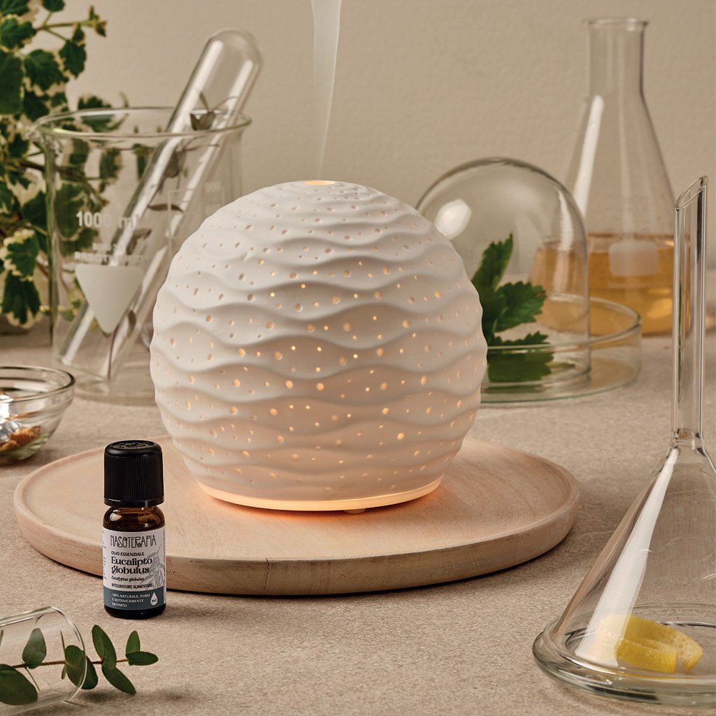 Ultrazvukový difuzér Onde s vlnkovaným motivem nejen účinně provoní váš interiér, ale díky elegantnímu provedení z keramiky se stane i krásným doplňkem. Rozptyluje vonný nebo esenciální olej přidaný do vody v nádobce a společně s efektním podsvícením a jemnou mlhovinou vytváří příjemnou atmosféru.