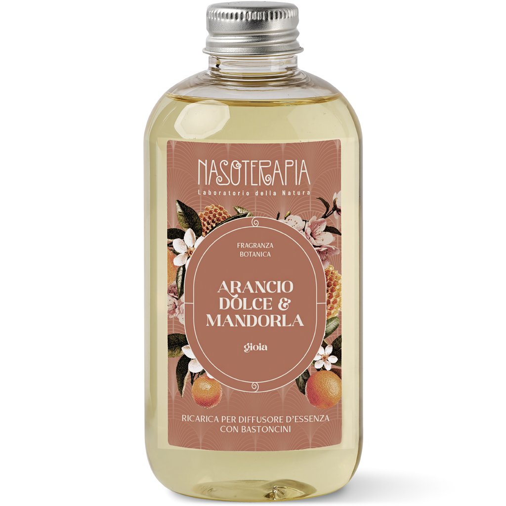 Náhradní náplň do difuzéru s tyčinkami Nasoterapia se sváteční vůní lahodných mandlí a sladkého pomeranče. Při změně náplně stačí prázdnou nádobu vypláchnout teplou vodou a vložit nové tyčinky, které nejsou součástí balení. Pro optimální rozptýlení vůně použijte originální tyčinky Nasoterapia.