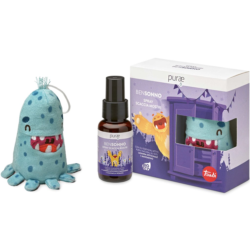 Má vaše dítě potíže s usínáním, trápí ho malé příšerky ve snech, v noci se často budí nebo se ráno probouzí příliš brzy? Kouzelná sada s plyšovou příšerkou Trudi a přírodním sprejem proti příšerkám Bensonno pomáhá dětem zklidnit se před spaním, zahnat noční strachy a spát celou noc s pocitem klidu a bezpečí. Jemná vůně ze 100% čistých a přírodních výtažků levandule, heřmánku a mandarinky zpříjemňuje dýchání, napomáhá hlubokému uvolnění a přináší dětem i maminkám úlevu od neklidného spaní i nočního vstávání.