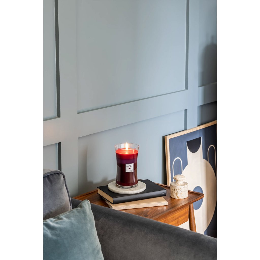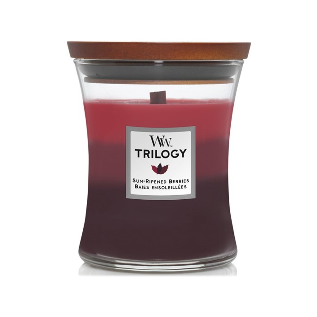 Vonná svíčka WoodWick Trilogy obsahuje tři vzájemně sladěné vůně v elegantní skleněné váze s dřevěným víčkem. Tři barevné vrstvy obsahují vůně, které se při hoření postupně prolínají a vytváří jedinečný voňavý zážitek. Patentovaný dřevěný knot Pluswick® má extra zářivý plamen a přináší jedinečný zážitek praskání, připomínající oheň v krbu. Směs prémiového parafínu a sójového vosku s vysoce koncentrovanými vůněmi zajišťuje čisté hoření a intenzivní provonění. Po vypálení můžete sklenici využít jako vázu na květiny či pro další dekorační účely.